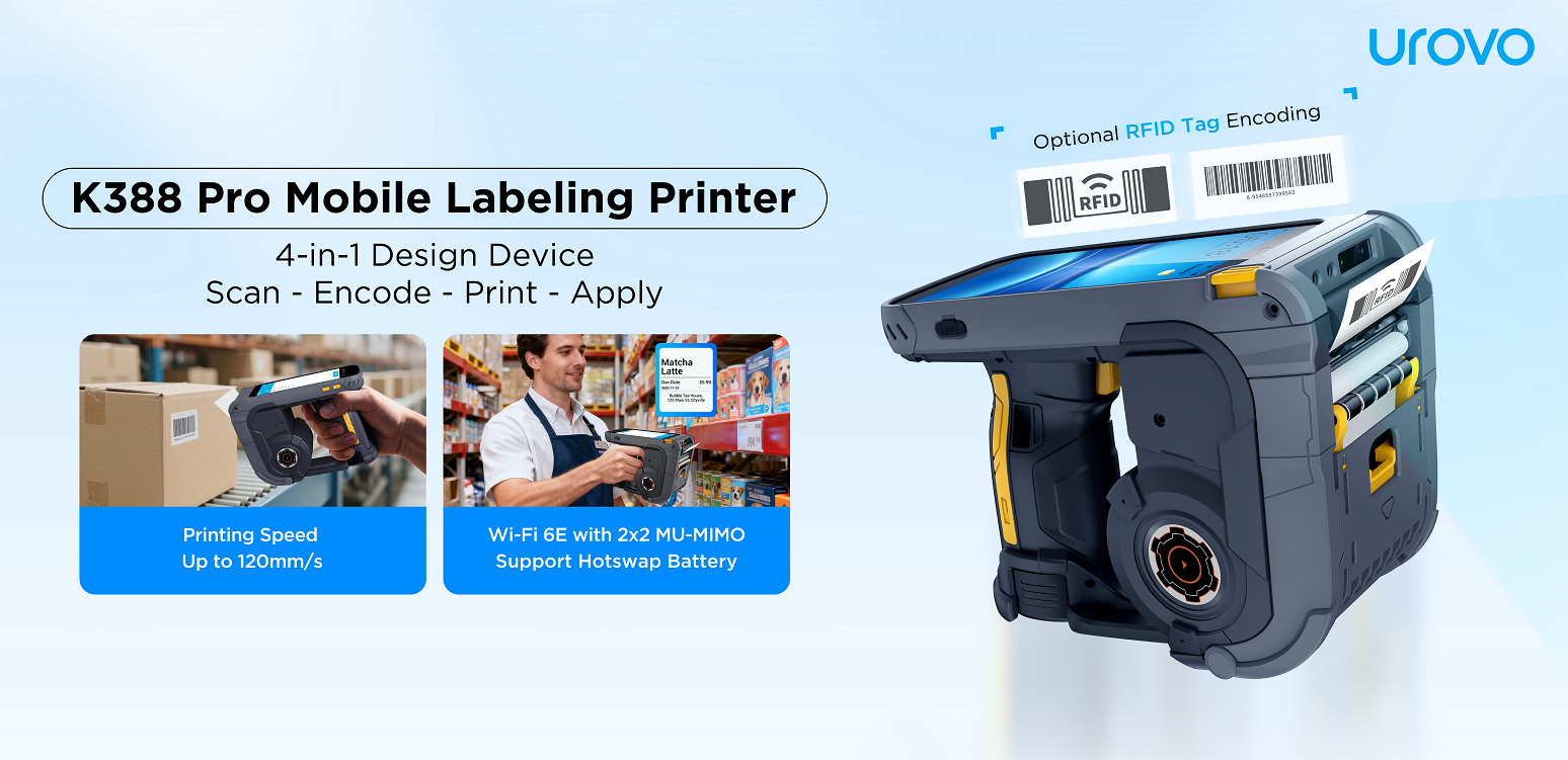 K388 Pro Smart Mobile Labeling Printer — Handheld all-in-one device with 1.5-second high-speed printing, Wi-Fi 6E connectivity, and optional RFID, designed to streamline retail and logistics labeling workflows.